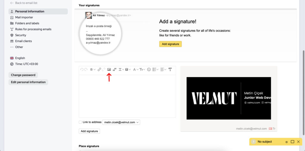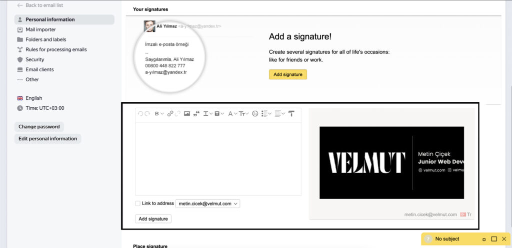 On the screen that appears, you can create and customize your Yandex Mail signature from the area indicated by the frame. Or you can add your own designed image by providing a link to it.